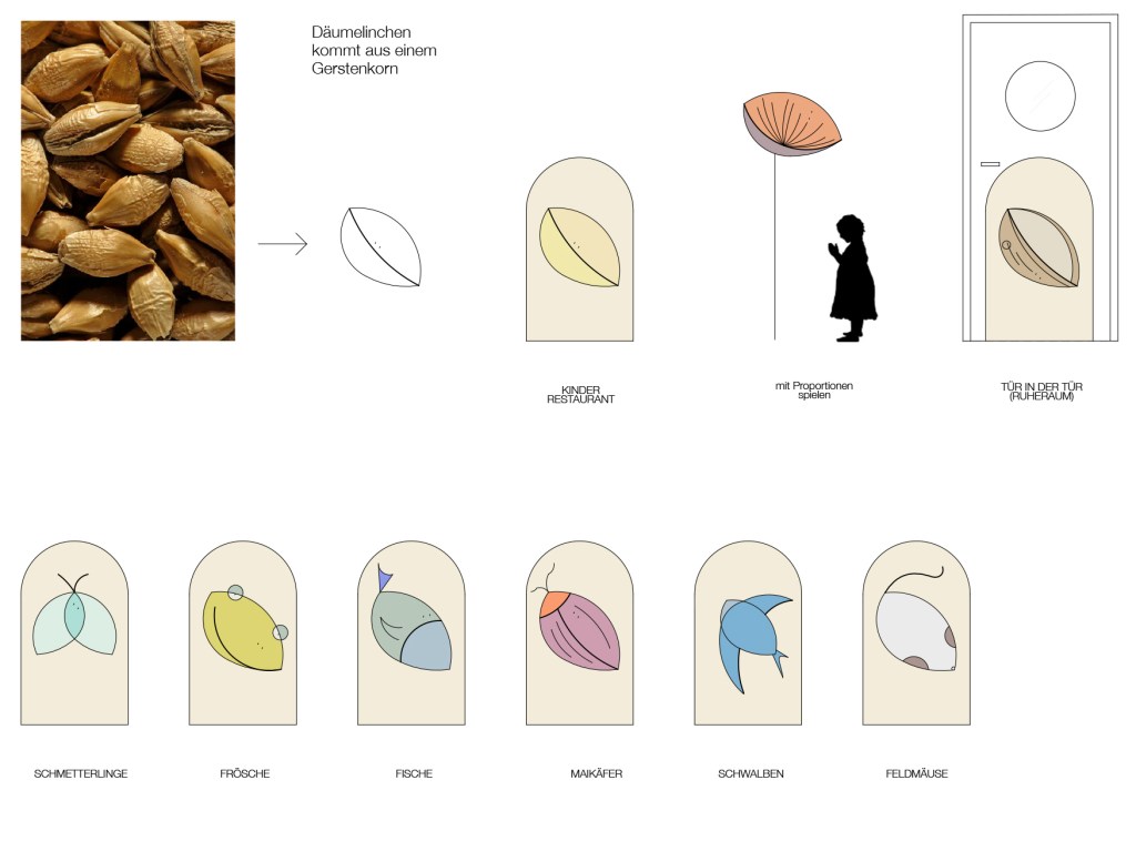 The main corridors are reminiscent of the settings in which Thumbelina wanders on her journey: the field and the pond.
