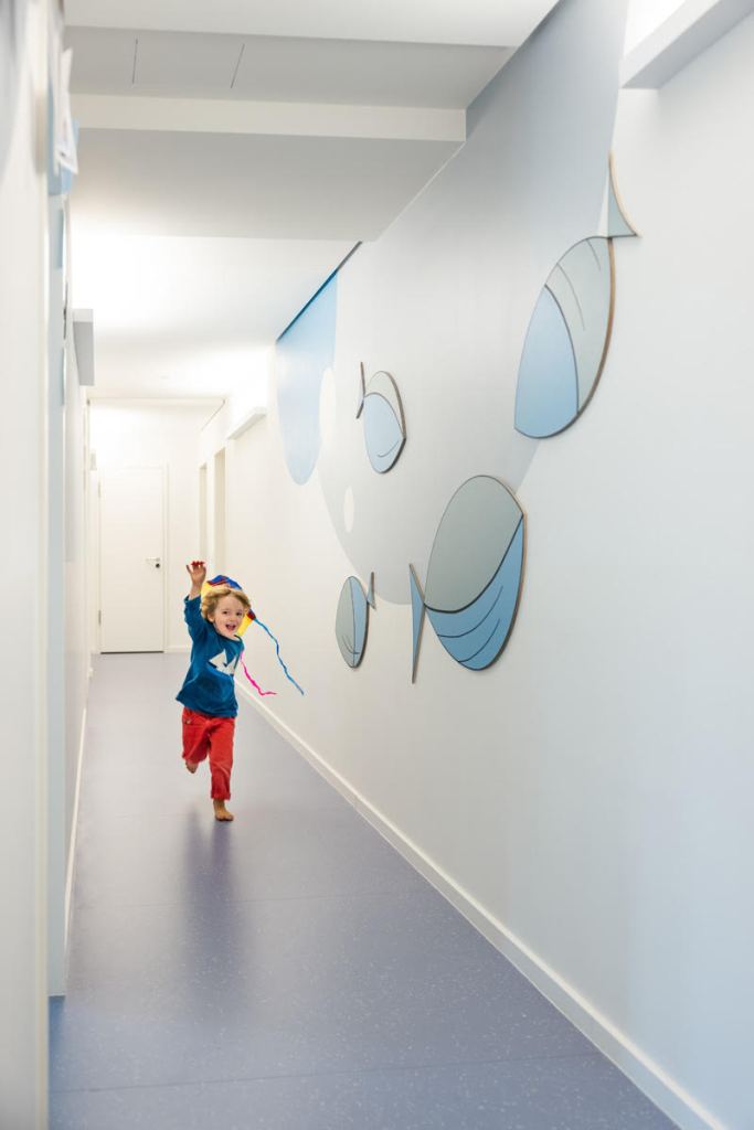 Earth, water and sky are recognisable in the design of the furniture as well as in the paints on the corridor walls.