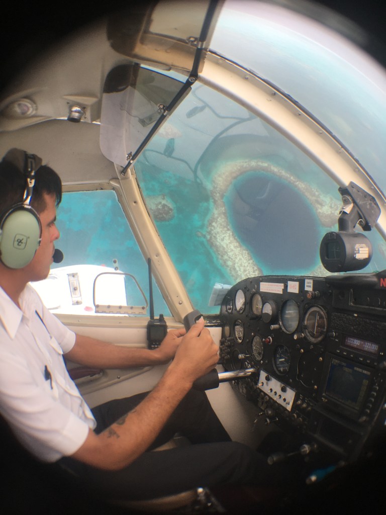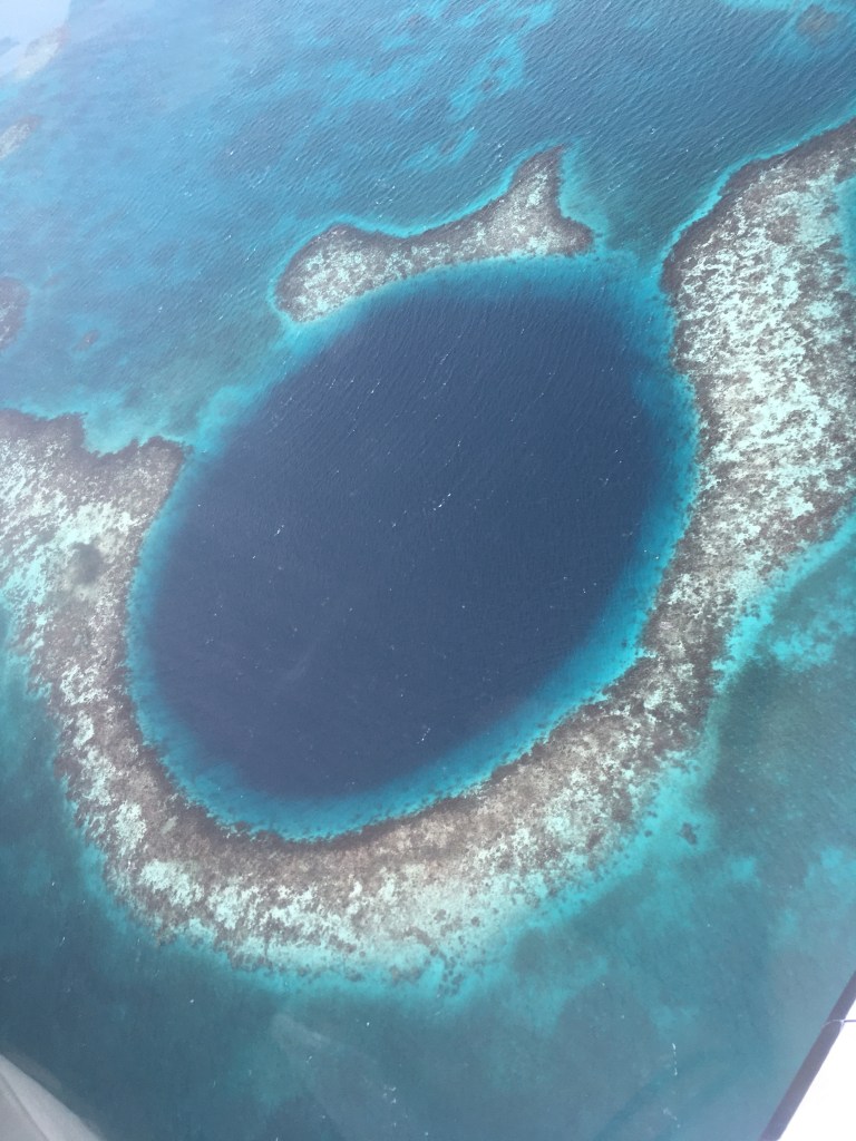 The Great Blue Hole is a large marine sinkhole located east of the coast of Belize in the Caribbean Sea. Jacques-Yves Cousteau made the first explorations at this site in 1971 with his ship Calypso to monitor its depth. The cavity is almost perfectly circular, over 300 metres wide and 123 metres deep. As part of the Belize Barrier Reef it is recognized by UNESCO as a World Heritage Site.