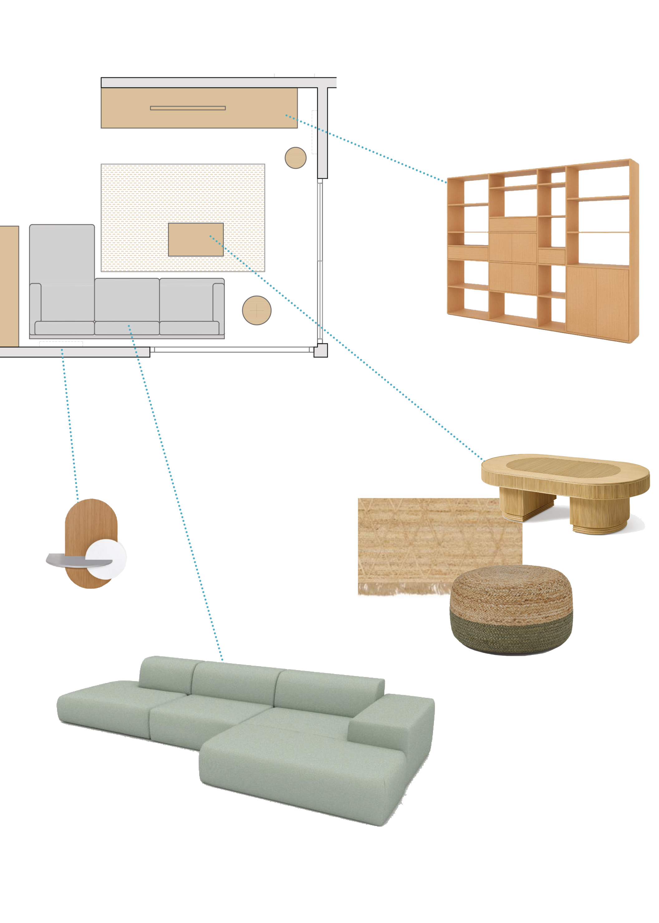 I provide design concepts containing a mood board, an arrangement proposal and a list of 3 options for each piece of furniture you are looking for.